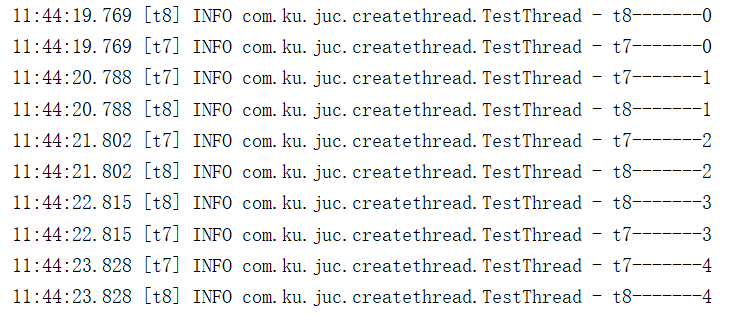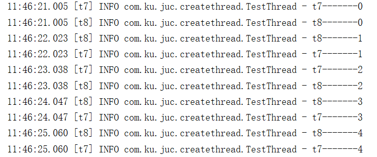 Thread t7 = new Thread(() -> { for (int i = 0; i < 5 ; i++) { try { Thread.sleep(1000); log.info(Thread.currentThread().getName()+ "-------" + i); } catch (InterruptedException e) { e.printStackTrace(); } } }, "t7"); Thread t8 = new Thread(() -> { for (int i = 0; i < 5 ; i++) { try { Thread.sleep(1000); log.info(Thread.currentThread().getName()+ "-------" + i); } catch (InterruptedException e) { e.printStackTrace(); } } }, "t8"); t7.start(); t8.start();