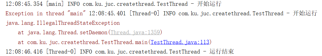 从上述第二张图可以看出,当我们设置线程t11为守护线程的时候,它在主线程执行完后,不会再继续执行,另外一点请注意一点,那就是必须在t11.start()方法执行之前通过t11.setDaemon(true)来设置线程t11为守护线程,不然会像上面第一张图那样报错。