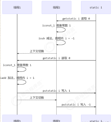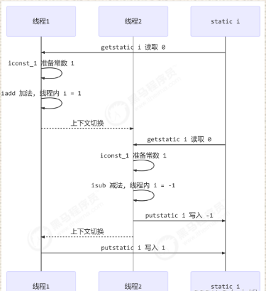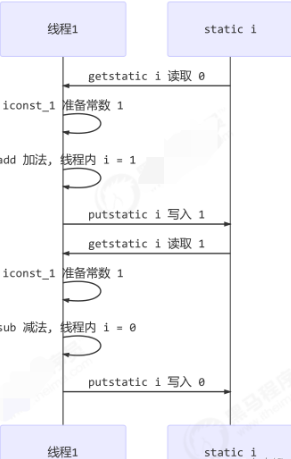 getstatic i // 1.获取静态变量i的值 iconst_1 // 2.准备常量1 iadd // 3.自增 putstatic i // 4.将修改后的值存入静态变量i