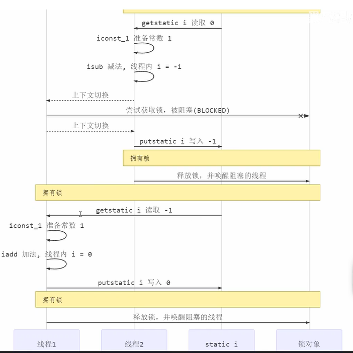 为了避免临界区的竞态条件发生,有很多手段可以处理这个问题,常用的阻塞式解决方法就有synchronized、ReenTrantLock;非阻塞式的解决方案由原子变量。本节通过synchronized来解决上述问题。synchronized也被称为对象锁,它采用互斥的方式允许同一时刻最多一个线程能够持有对象锁,其它线程想获得这个对象锁时就会被阻塞住。对象锁去被爱了拥有锁的线程可以安全的执行临界区的代码,不用担心线程上下文切换所造成的数据错误。