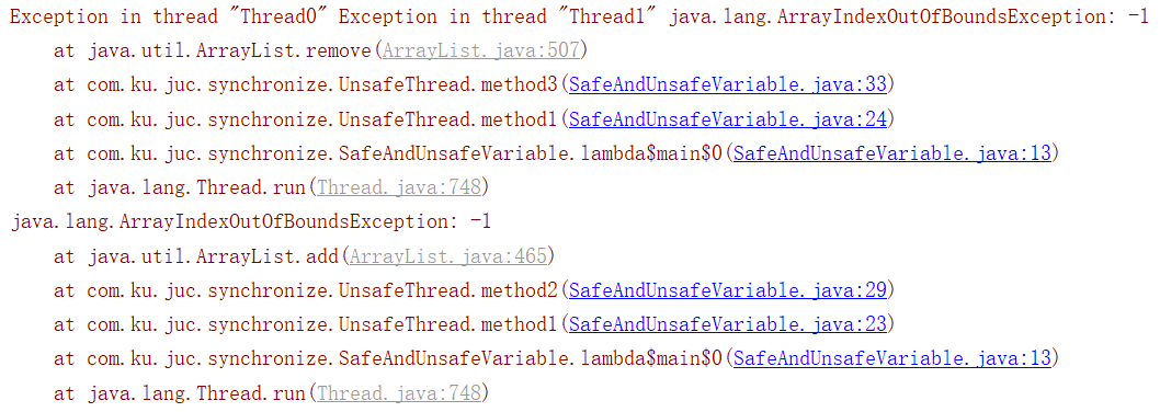 public class SafeAndUnsafeVariable { static final int THREAD_NUMBER = 2; static final int LOOP_NUMBER = 200; public static void main(String[] args) { UnsafeThread unsafeThread = new UnsafeThread(); for (int i = 0; i < THREAD_NUMBER; i++) { new Thread(() -> { unsafeThread.method1(LOOP_NUMBER); }, "Thread"+i).start(); } } } class UnsafeThread{ ArrayList<String>list = new ArrayList<>(); public void method1(int loopNumber){ for (int i = 0; i < loopNumber; i++) { method2(); method3(); } } public void method2(){ list.add("1");//添加字符串1 } public void method3(){ list.remove(0);//移除列表中索引为0的元素 } }
