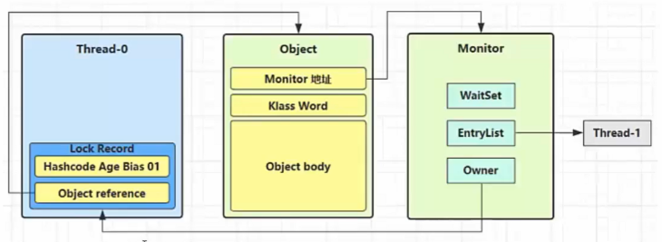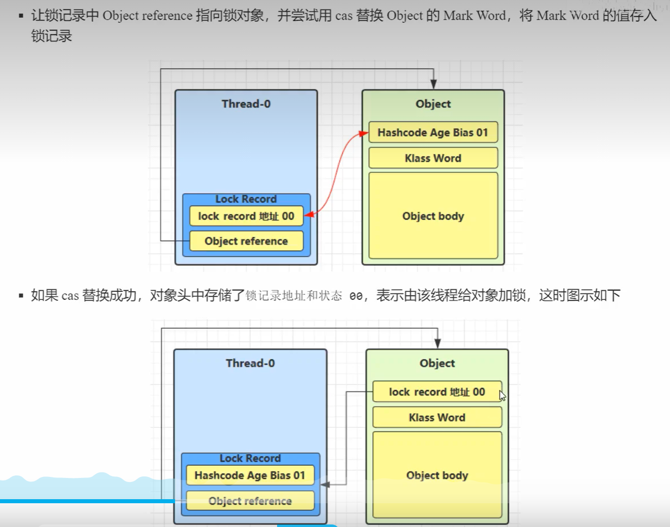 2.如果CAS替换成功,Object对象头中存储线程Thread-0的lock record地址和状态00,表示此时由线程Thread-0给对象Object加锁。