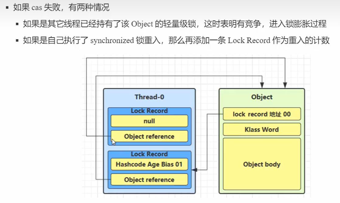 1.当线程Thread-1对对象Object尝试加上轻量级锁时,线程Thread-0已经对该对象加上了轻量级锁;