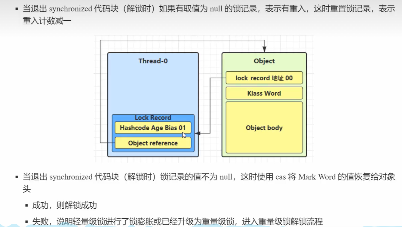 1.当线程Thread-0退出synchronized代码块时,如果lock record为null表明有重入,这是重置lock record,表示重入计数减一;