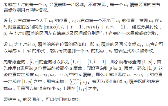 有 n 个草堆堆,每个草堆堆燃起了 ai 亮度的火苗。 每个时刻,会有风从左往右吹, 对于每个 ai,会变成 max(ai-1,ai)(同时变)。 默认 a0 = 0。 有 q 次询问,问 t 时刻,[l, r] 中火苗的亮度和。初始是 0 時刻。