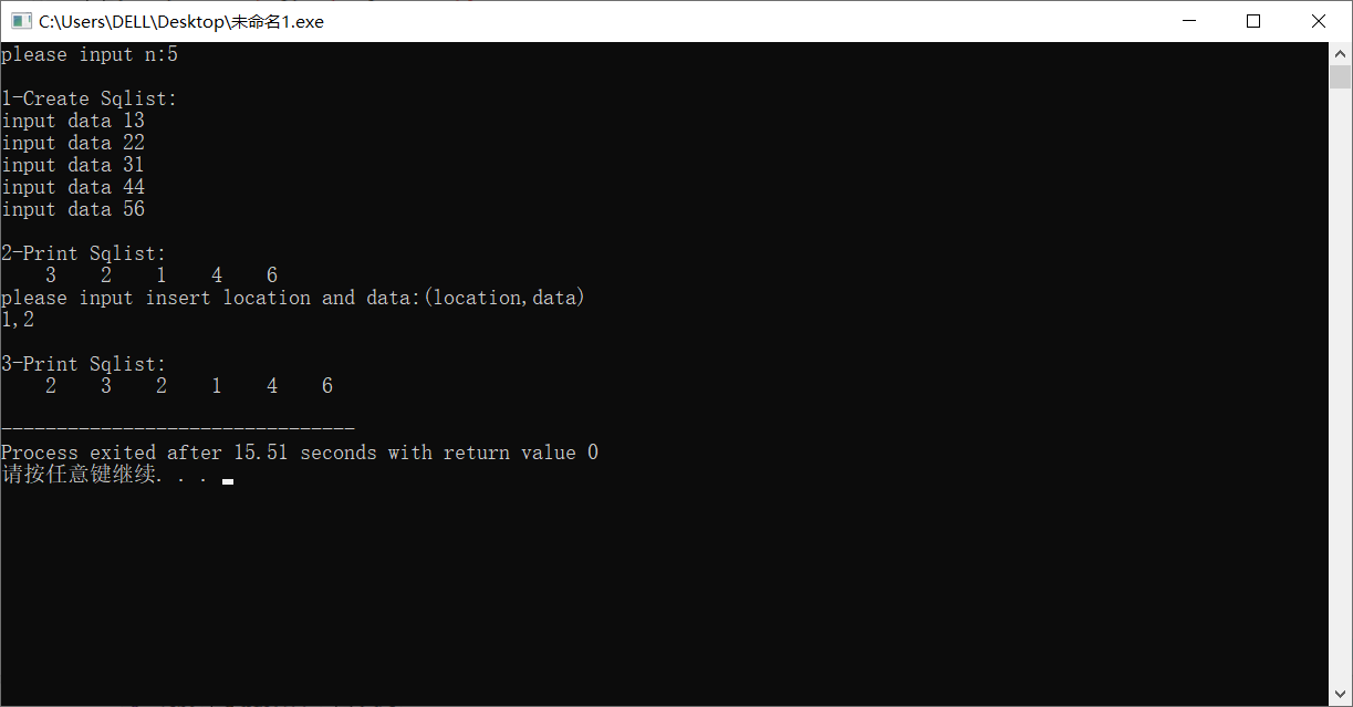 4、为第3题补充插入功能函数和删除功能函数。并在主函数中补充代码验证算法的正确性。