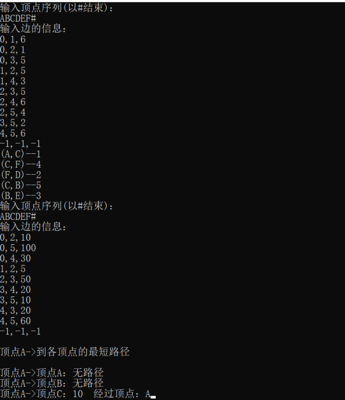 下面的输入分别验证prim算法和dijstra算法。输入实例的第一部分为无向图,求其最小生成树;输入的第二部分为有向图,求其最短路径。