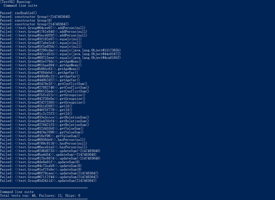 从测试数据来看,JMLUnitNG生成的测试样例主要都是null,0以及int可以表示的最大值和最小值,只是测试边界情况,不能进行覆盖性的测试。