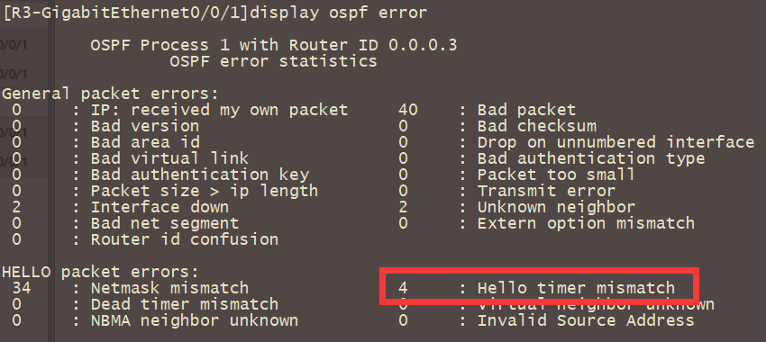 [R3]interface g0/0/1 [R3-GigabitEthernet0/0/1]ospf timer hello 1