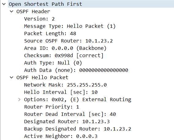 [R2-GigabitEthernet0/0/1] Feb 13 2022 11:39:05-08:00 R2 %%01OSPF/4/NBR_CHANGE_E(l)[6]:Neighbor changes event: neighbor status changed. (ProcessId=256, NeighborAddress=3.23.1.10, NeighborEvent=LoadingDone, NeighborPreviousState=Loading, NeighborCurrentState=Full) [R2-GigabitEthernet0/0/1]display ospf peer brief OSPF Process 1 with Router ID 10.1.23.2 Peer Statistic Information ---------------------------------------------------------------------------- Area Id Interface Neighbor id State 0.0.0.0 GigabitEthernet0/0/0 10.1.14.1 Full 0.0.0.0 GigabitEthernet0/0/1 0.0.0.3 Full ----------------------------------------------------------------------------