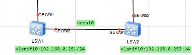 [SW2]vlan 10 [SW2-vlan10]quit [SW2]interface g0/0/1 [SW2-GigabitEthernet0/0/1]port link-type trunk [SW2-GigabitEthernet0/0/1]port trunk allow-pass vlan all [SW2]ospf 1 router-id 0.0.0.6 [SW2-ospf-1]area 10 [SW2]interface vlanif 10 [SW2-Vlanif10]ip address 192.168.0.253 24 [SW2-Vlanif10]ospf enable 1 area 10