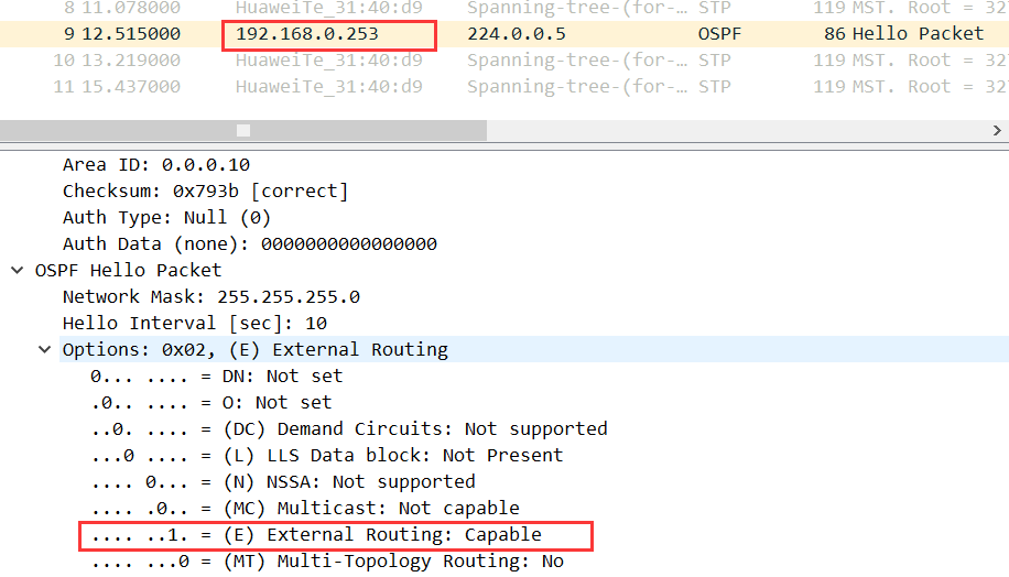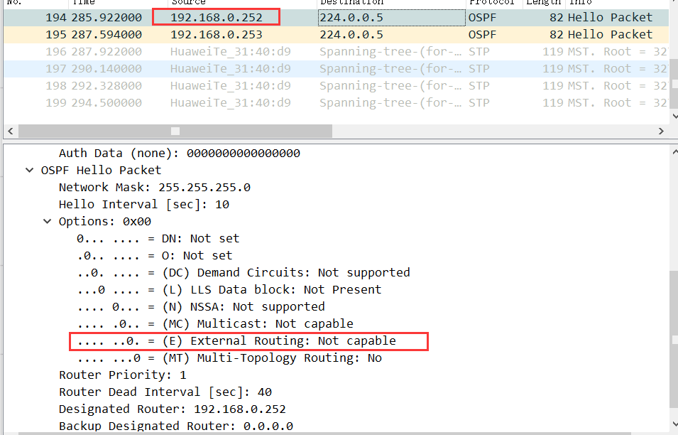 ④邻居立刻进入DOWN状态,并且抓包发现,源为192.168.0.252的SW1的Hello报文中,接收外部路由的功能位置零