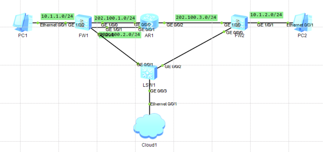 10.1.1.0/24是FW1的trust区域的内网网段,10.1.2.0/24是FW2的trust区域的内网网段。AR1是ISP设备,假设FW1是总部,FW2是分支。FW1和FW2通过公网建立IPSec虚拟专用网络,通过GE1/0/0和GE1/0/1达到主备链路冗余的效果。在GE1/0/0的链路发生故障时,也能切换到GE1/0/1来建立IPSec虚拟专用网络。