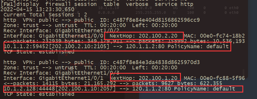 2.查看防火墙全局选路的状态,现象虽然不是很明显但也差不多。根据流量负载分担。根据Hedex文档上解释为: