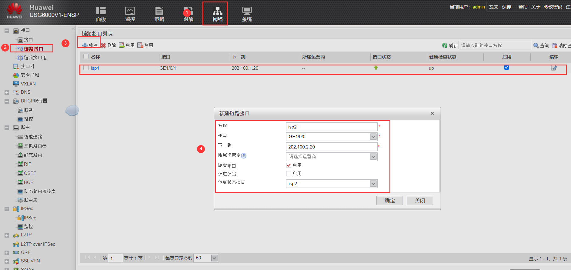 [FW1]link-interface 0 name isp1 [FW1-linkif-0]interface GigabitEthernet 1/0/1 next-hop 202.100.1.20 [FW1-linkif-0]healthcheck isp1