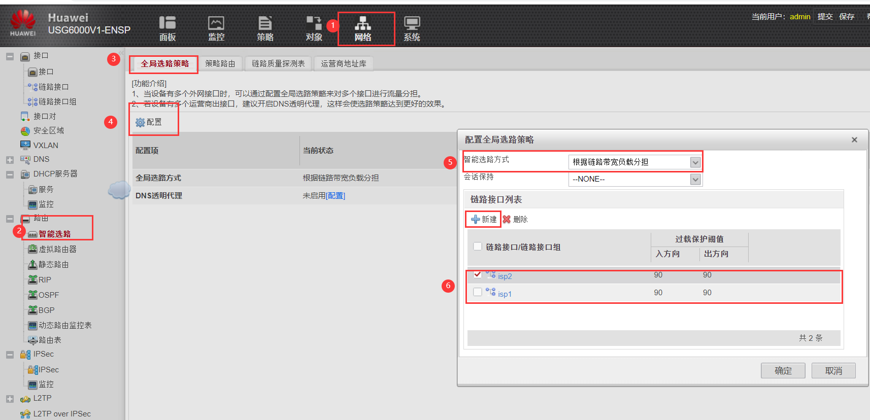 根据链路带宽负载分担是默认的智能选路方式。当企业从不同ISP处获得多条带宽不等的链路时,为了充分利用各链路的带宽,提高链路的利用率,可以选择此种选路方式。
