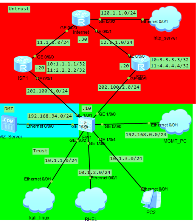 | ISP2 | GE0/0/0 | untrust | 12.1.1.20/24 |