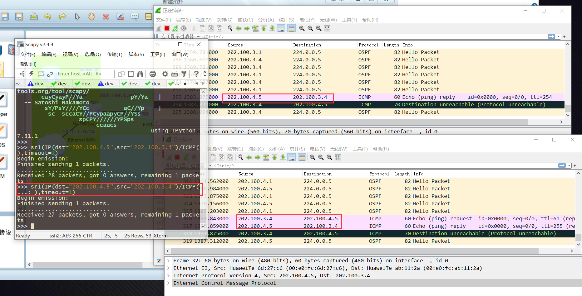 >>> sr1(IP(dst="202.100.4.5",src="202.100.3.4")/ICMP(),timeout=1) Begin emission: Finished sending 1 packets. ............................ Received 28 packets, got 0 answers, remaining 1 packets
