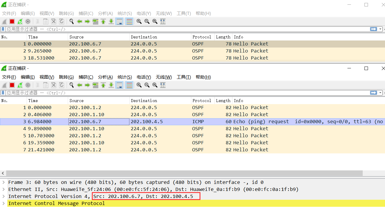 抓取FW1的GE1/0/2和GE1/0/0口分别是截图中的上下窗口,报文并未被转发: