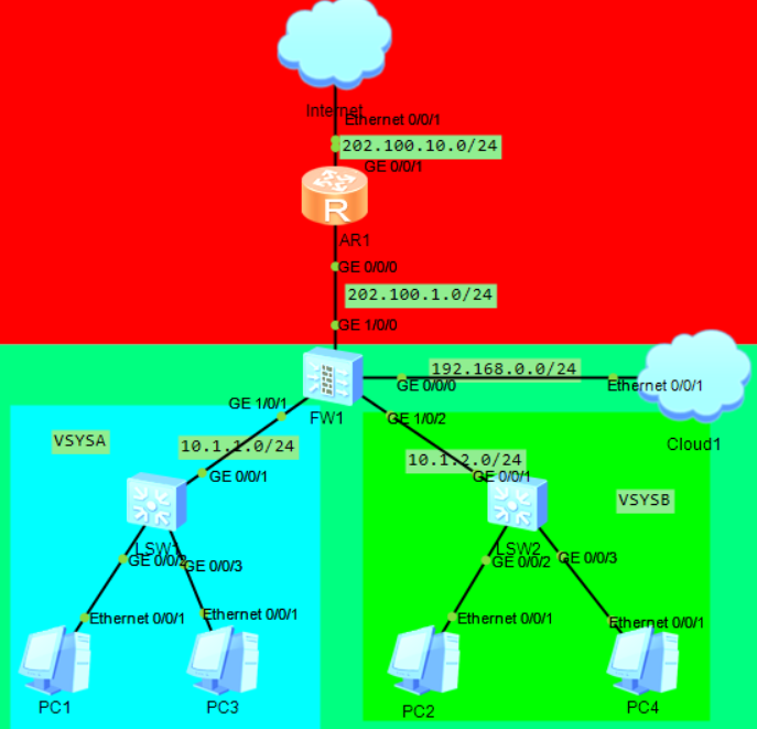 Internet桥接网卡能上公网,cloud1桥接网卡能使用PC管理FW图形化web。在FW上创建虚拟系统VSYSA和VSYSB使内网可以互访。