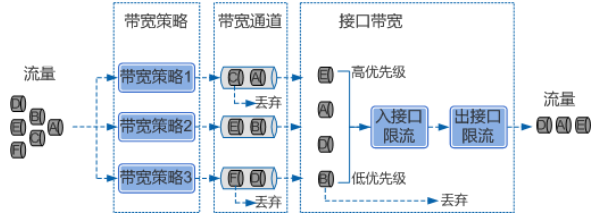 ②受入接口带宽的限制,如果流量大于入接口带宽,将根据带宽通道中设置的转发优先级对流量进行队列调度,保证高优先级的报文被优先发送。