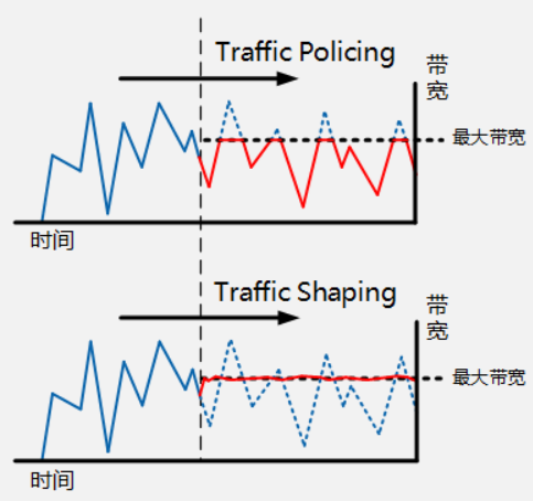 流量转发优先级:FW支持为带宽通道配置流量转发优先级。当流量转发优先级配置为“中(4)”时,默认采用流量监管(Traffic Policing)的方式进行带宽限制;当带宽通道中的流量转发优先级不为“中(4)”时,默认采用流量整形(Traffic Shaping)的方式进行带宽限制。此时,超过带宽上限值的峰值流量和突发流量报文的转发优先级会被修改,优先级大于4的报文会被优先发送,优先级小于4的报文则会被延后发送。①流量监管:通过CAR机制限制网络中的峰值流量和突出流量,若某个连接的报文流量超过带宽通道中设置带宽上限值,则报文直接丢弃。②流量整形:通过队列机制,将超过带宽上限值的峰值流量和突发流量报文延迟传输,在限制网络中突发流量的同时调整流量的输出速率,使报文比较均匀的速度向外发送。