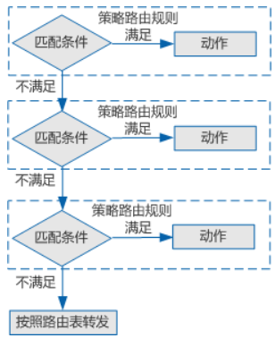 当FW配置了多条策略路由规则时,FW会按照匹配顺序,先寻找第一条规则,如果第一条满足,则按照指定动作处理报文。如果不满足就寻找下一条策略路由规则。如果所有策略路由规则的匹配条件都无法满足,报文按照路由表进行转发。