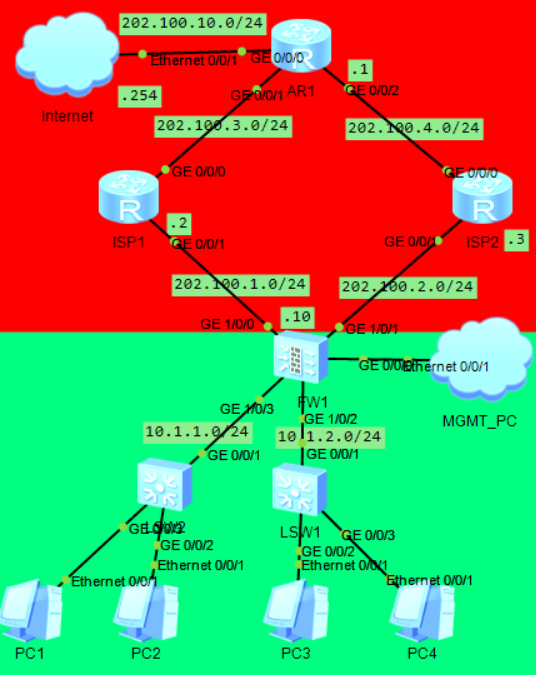 [FW1]ip route-static 0.0.0.0 0 202.100.1.2 track ip-link isp1 [FW1]ip route-static 0.0.0.0 0 202.100.2.3 track ip-link isp2