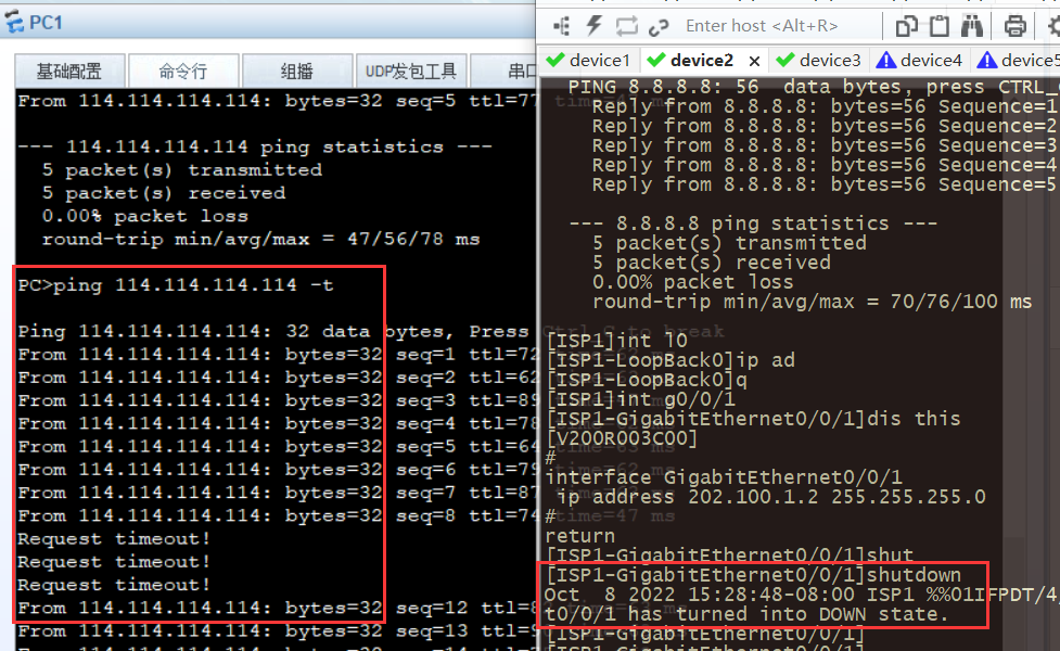 4.测试监测联动,使用PC1与公网通信,并断开FW与ISP1的连接。短暂的丢包后恢复通信。