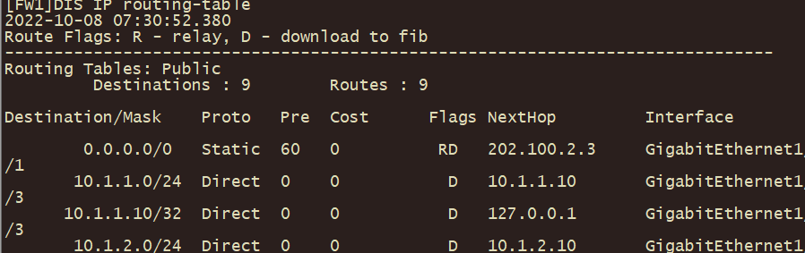 [FW1]display policy-based-route rule all 2022-10-08 07:27:35.190 Total:3 RULE ID RULE NAME STATE ACTION HITS ------------------------------------------------------------------------------- 1 ISP1 enable pbr 25 2 ISP2 enable pbr 10 0 default enable no-pbr 100 -------------------------------------------------------------------------------