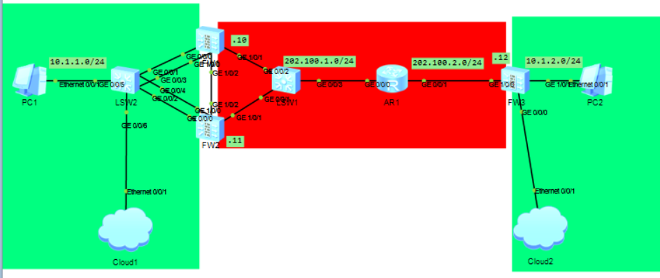 FW1和FW2做三层上下行连接交换机的主备备份,虚拟IP的主机位均是100。建立双机热备后使用虚拟IP与FW3建立IPSec VPN,使得trust区域的PC可以通过VPN互通。