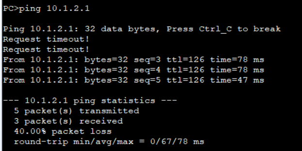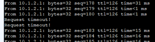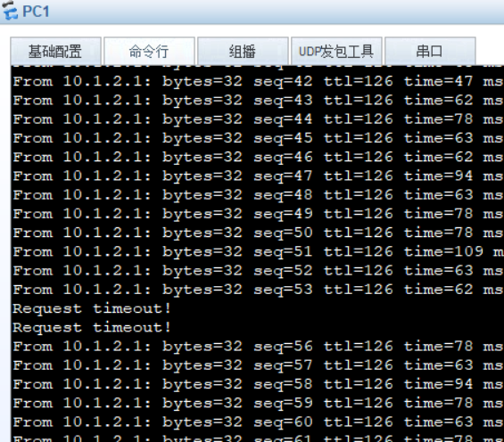 4.断开SW2的G0/0/2,使得双机热备主备切换。观察现象,PC1的通信短暂的终端后恢复。