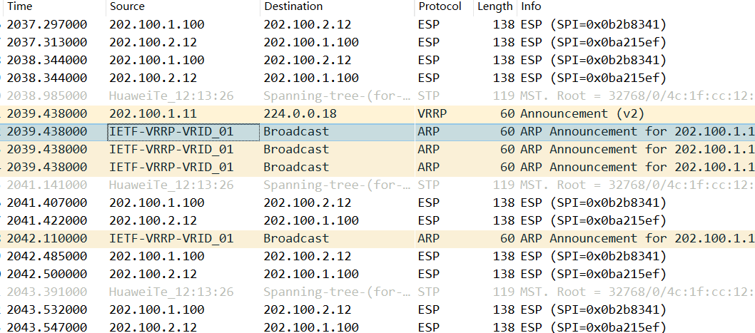 HRP_M[FW1]display vrrp brief 2022-10-15 01:52:33.360 Total:2 Master:2 Backup:0 Non-active:0 VRID State Interface Type Virtual IP ---------------------------------------------------------------- 1 Master GE1/0/1 Vgmp 202.100.1.100 2 Master GE1/0/0 Vgmp 10.1.1.100 HRP_S[FW2]display vrrp brief 2022-10-15 01:52:41.780 Total:2 Master:0 Backup:2 Non-active:0 VRID State Interface Type Virtual IP ---------------------------------------------------------------- 1 Backup GE1/0/1 Vgmp 202.100.1.100 2 Backup GE1/0/0 Vgmp 10.1.1.100
