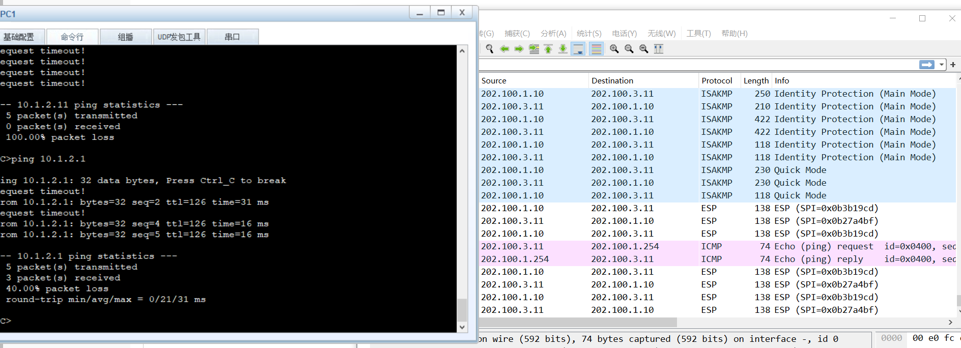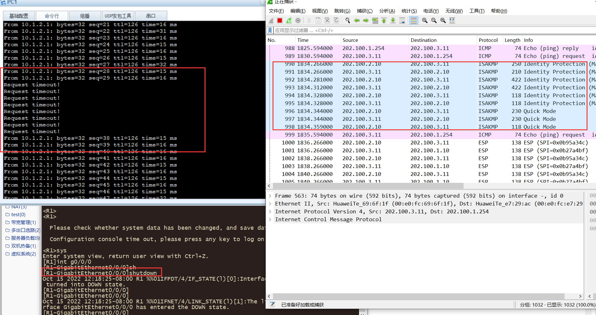 1.PC1发起访问,并抓包。(做的时候发现ping不通,因为忘记了将Tunnel口加安全区域)