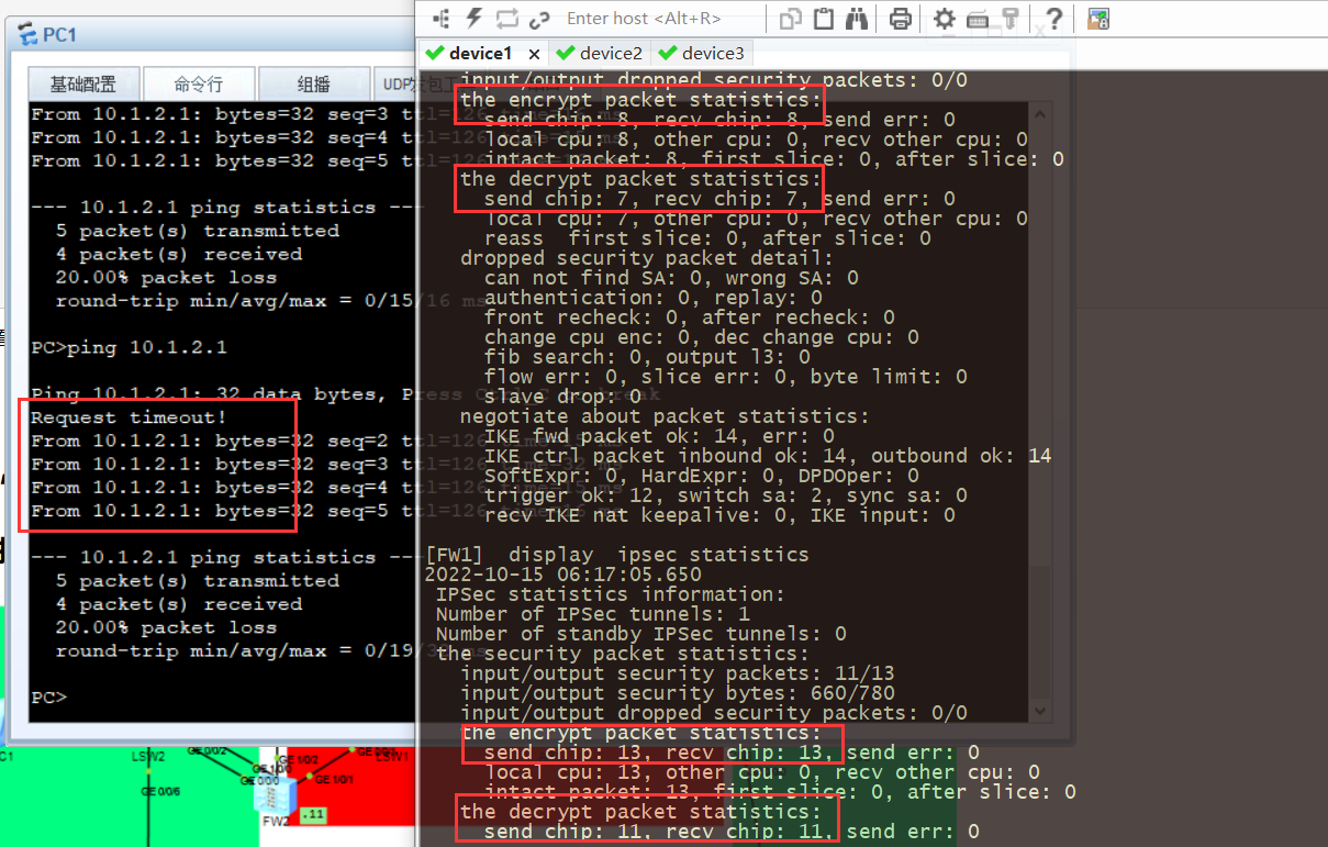 4.查看加密统计,ping5次丢包一次,查看表对比ping之前的结果,加密增加5个,解密增加4个,正确的。
