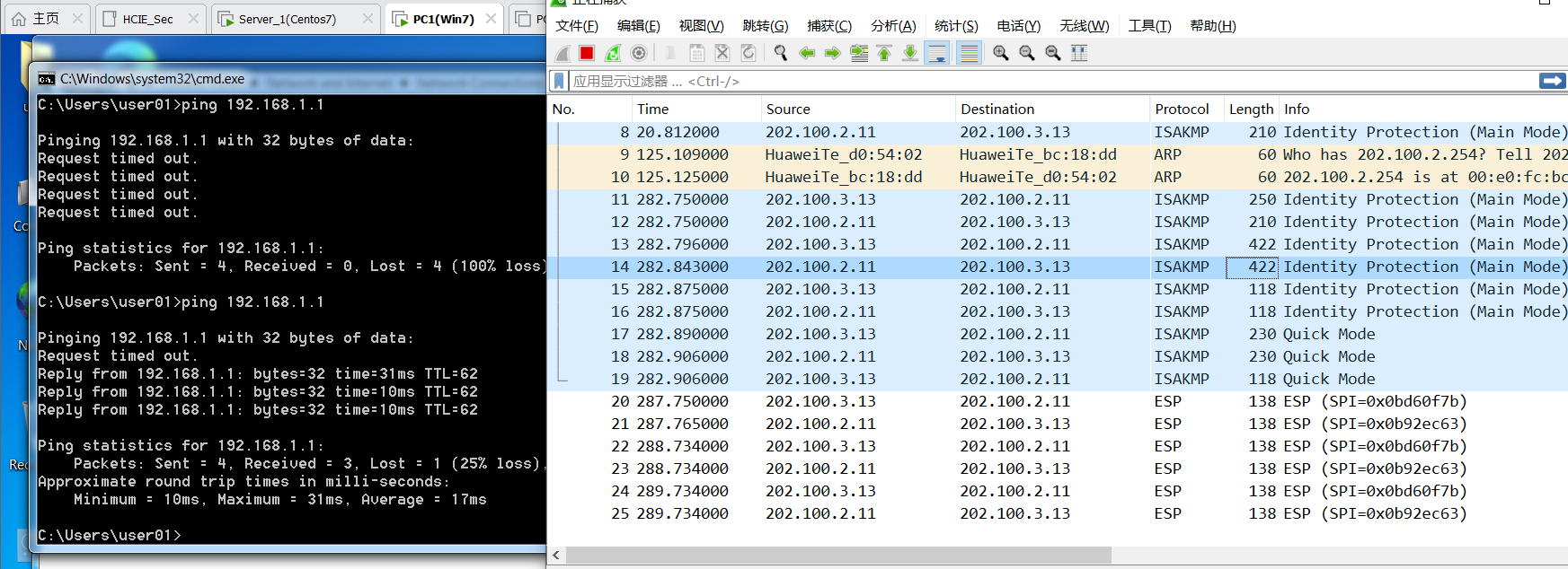 1.使用PC1与Server1通信并抓包发现完成了IPSec的通信