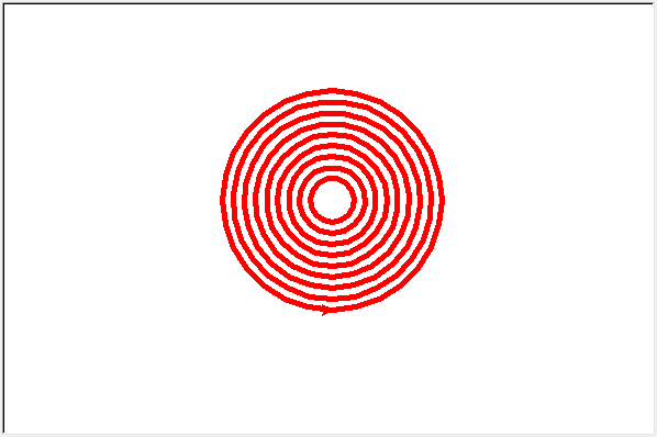 from turtle import * # 设置窗体的大小和位置,参数依次为窗体的宽、高、相对于桌面起始点的横坐标、纵坐标 setup(600,400,500,200) # 画笔颜色 color("red") # 画笔宽度 pensize(5) # 画一个半径为20的圆 circle(20) # 修改画笔宽度 pensize(5) # for循环,用于绘制同心圆 for i in range(1,9): # 画笔抬起(不会在窗体上留下痕迹) penup() # 移动画笔到坐标(0,-10*i) goto(0,-10*i) # 画笔落下(开始在窗体上留下痕迹) pendown() # 在循环中不断绘制半径不同的圆 circle(20+i*10) done()