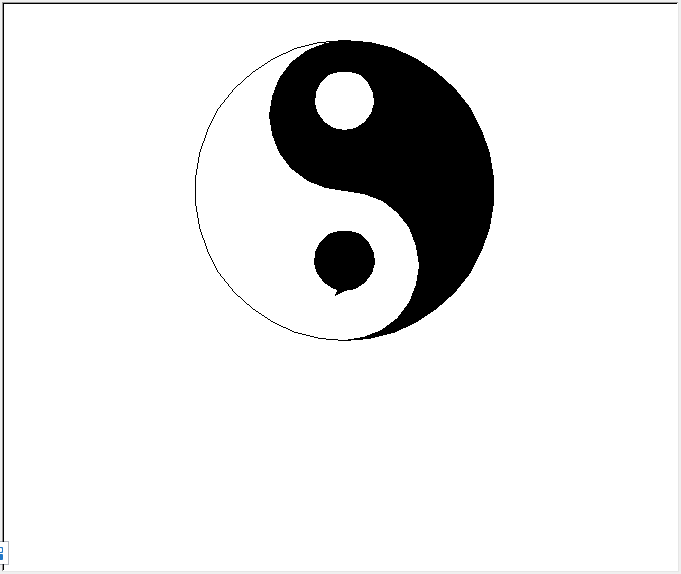 import turtle t=turtle.Turtle() t.penup() t.goto(0,-50)#设置起始坐标 t.pendown() t.begin_fill() t.fillcolor('black') t.circle(150,extent=180) t.circle(75,extent=180)#半径正负代表逆时针和顺时针画 t.circle(-75,extent=180) t.end_fill() t.circle(-150,extent=180) t.penup() t.goto(0,160) t.pendown() t.begin_fill() t.fillcolor("white") t.circle(30,extent=360) t.end_fill() t.penup() t.goto(0,0) t.pendown() t.begin_fill() t.fillcolor("black") t.circle(30,extent=360) t.end_fill() turtle.done()