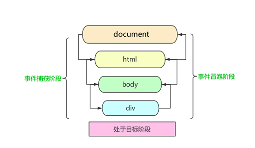 <div class="father"> <div class="son">son盒子</div> </div> <script> // 如果addEventListener() 第三个参数是 true 那么在捕获阶段触发 // document -> html -> body -> father -> son var son = document.querySelector('.son'); // 给son注册单击事件,第3个参数为true son.addEventListener('click', function() { alert('son'); }, true); var father = document.querySelector('.father'); // 给father注册单击事件,第3个参数为true father.addEventListener('click', function() { alert('father'); }, true); // 给document注册单击事件,第3个参数为true document.addEventListener('click', function() { alert('document'); }, true) </script>