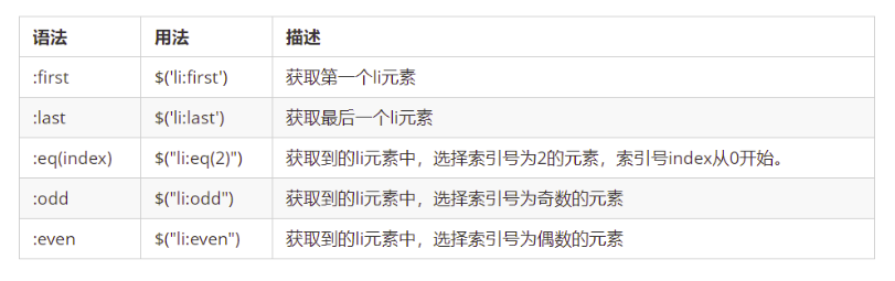 筛选选择器,顾名思义就是在所有的选项中选择满足条件的进行筛选选择。常见如下 :