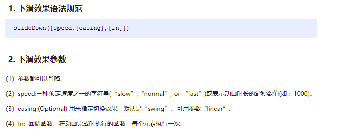 滑入滑出动画,常见有三个方法:slideDown() / slideUp() / slideToggle() ;