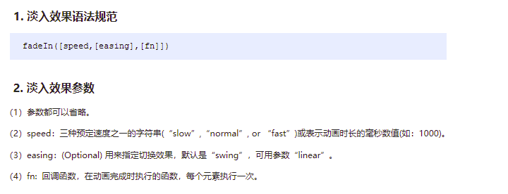 淡入淡出动画,常见有四个方法:fadeIn() / fadeOut() / fadeToggle() / fadeTo() ;