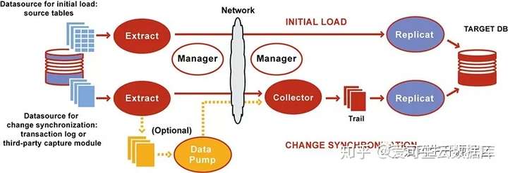 - Extract进程:运行在数据库源端,主要用于捕获数据的变化,负责全量、增量数据的抽取