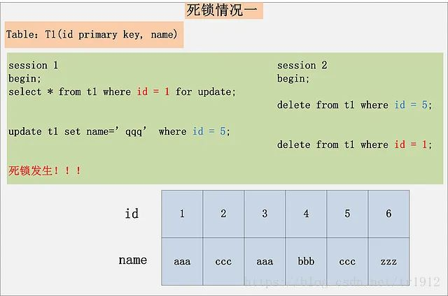 一般的情况,两个session分别通过一个sql持有一把锁,然后互相访问对方加锁的数据产生死锁。