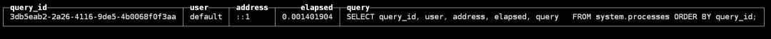 SELECT query_id, user, address, elapsed, query FROM system.processes ORDER BY query_id;
