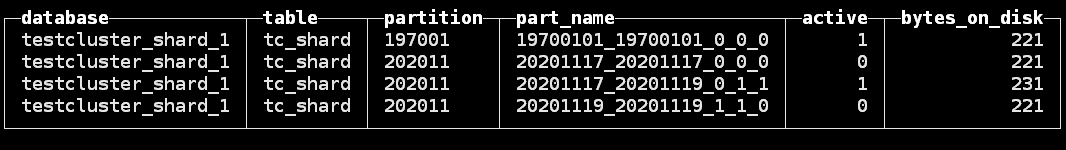 SELECT database, table, partition, name part_name, active, bytes_on_disk FROM system.parts where database not in 'system' ORDER BY database, table, partition, name;