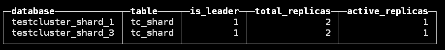 SELECT database, table, is_leader, total_replicas,active_replicas FROM system.replicas WHERE is_readonly OR is_session_expired OR future_parts > 20 OR parts_to_check > 10 OR queue_size > 20 OR inserts_in_queue > 10 OR log_max_index - log_pointer > 10 OR total_replicas < 2 OR active_replicas < total_replicas;
