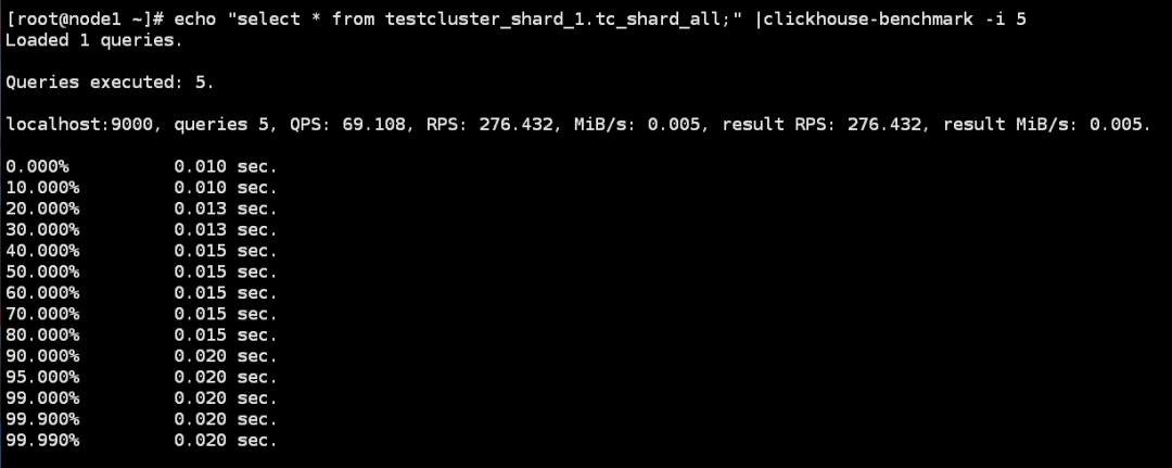 echo "select * from testcluster_shard_1.tc_shard_all;" |clickhouse-benchmark -i 5