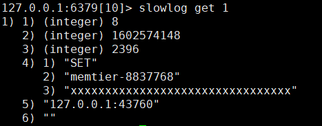 读取慢查询,可以执行 slowlog get 命令,表示显示所有的慢查询,如果执行 slowlog get 1,则表示只显示最新的一条慢查询,其输出内容如下: