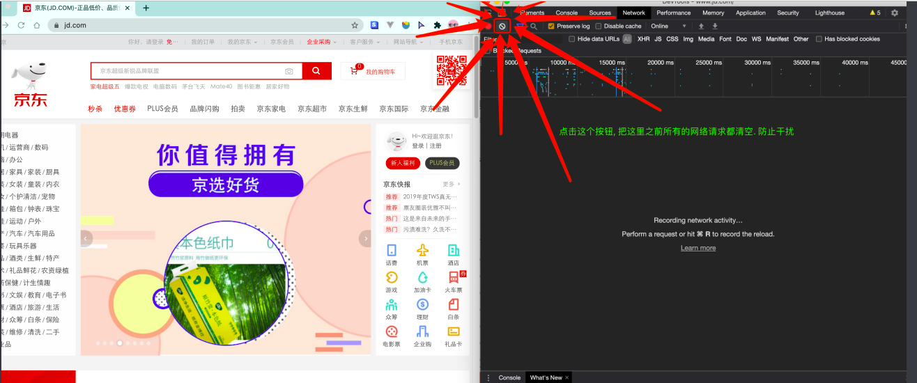 那数据是何时加载进来的呢? 其实就是在我们进行向下滚动的时候,jd就在偷偷的加载数据了, 此时想要看到这个页面的加载全过程,我们就需要借助浏览器的调试工具了(F12)。